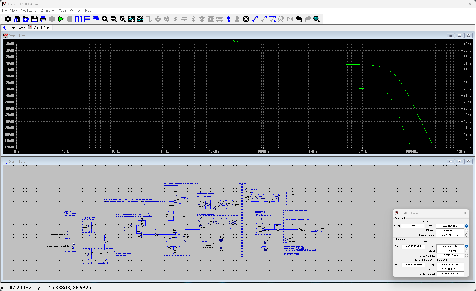 とか色々やっていると、シミュレーション上ではなんかそれなりに動くものが出来上がってしまった。なんか上手いこと奇跡的にちゃんとシミュレーション通りの回路が作れると、LEDでも20MHzくらい出せるみたい(まぁ世の中そんな上手くいくわけないのだけど)。